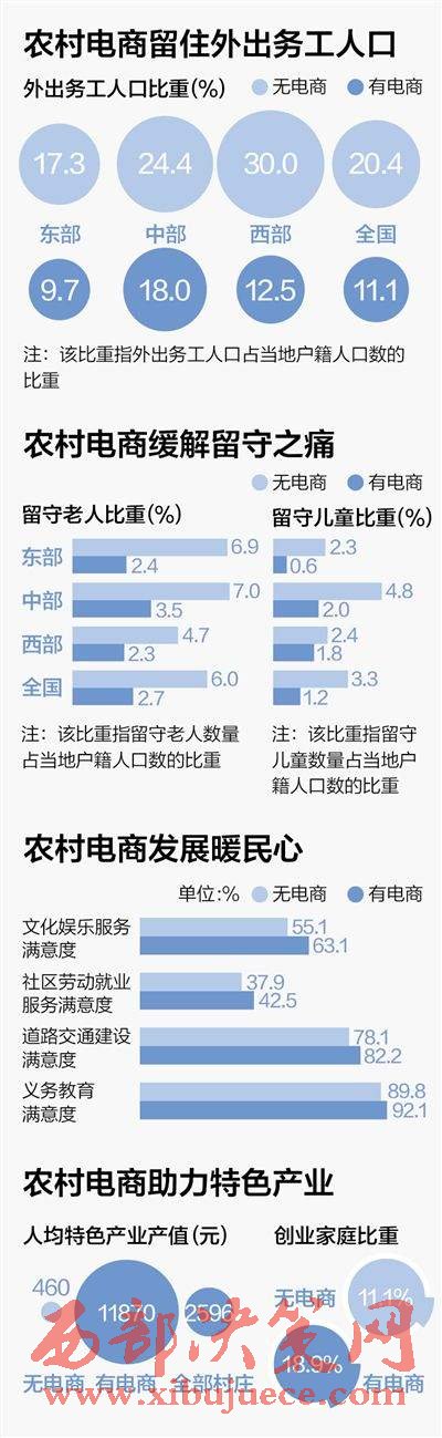 數(shù)據(jù)顯示:有電商村莊的留守老人和留守兒童的比重不到無電商村莊的一半;有電商村莊的村民對(duì)公共服務(wù)的滿意度更高。