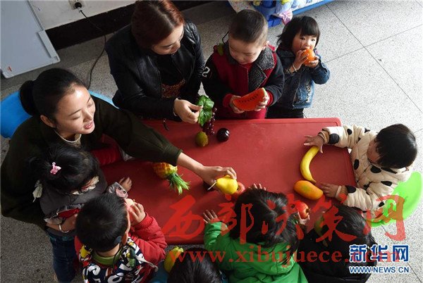 在合肥市瑤海區(qū)心怡康康復(fù)訓(xùn)練中心,孩子們和老師一起做水果游戲,練習(xí)辯物發(fā)音