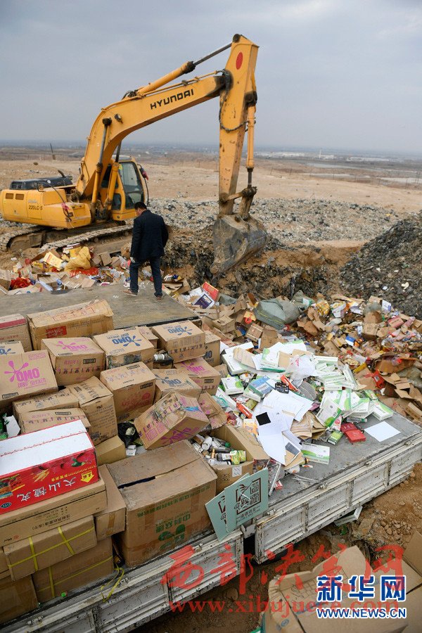 3月14日,在寧夏寧東垃圾填埋場,工作人員將假冒偽劣商品進(jìn)行填埋處理。“3·15”國際消費(fèi)者權(quán)益日即將到來之際,銀川市市場監(jiān)督管理局集中展示并銷毀食品、藥品、電器等32個(gè)類別的假冒偽劣商品。