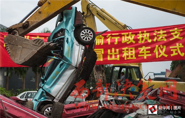 2016年6月16日上午,廣東深圳,深圳市交通運(yùn)輸行政執(zhí)法支隊(duì)在觀瀾大富扣車場舉行公開銷毀假冒出租車儀式,對查扣的484輛假冒出租車依法、公開、集中進(jìn)行銷毀。圖為銷毀現(xiàn)場,假“的士”在挖掘機(jī)的巨臂下變成廢鐵。