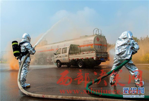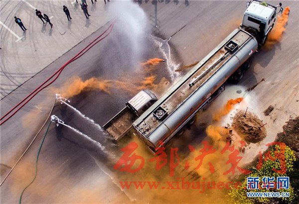 4月6日,參加演練人員對危化品運(yùn)輸車輛“交通事故”現(xiàn)場進(jìn)行處置。