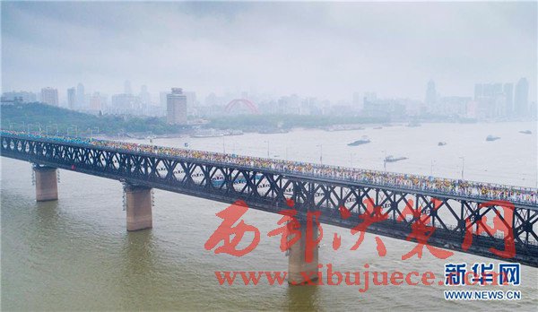 4月9日,馬拉松選手經(jīng)過武漢長江大橋上的補給點。