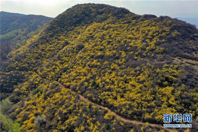 連翹花盛開(kāi)在平定縣冠山上(4月10日無(wú)人機(jī)拍攝)。