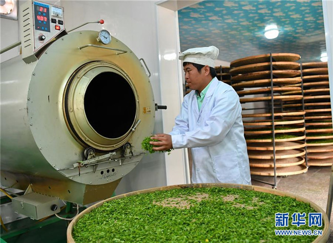 4月10日,平定縣冠山鎮(zhèn)后溝村的村民將連翹葉放入炒茶機(jī)。