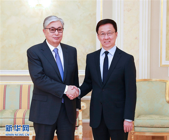 在會見托卡耶夫時,韓正首先轉(zhuǎn)達(dá)了習(xí)近平主席對托卡耶夫總統(tǒng)的親切問候。韓正說,在兩國元首的戰(zhàn)略引領(lǐng)和親自推動下,中哈全面戰(zhàn)略伙伴關(guān)系快速發(fā)展,雙方政治互信日益加深,各領(lǐng)域合作處于歷史最好水平,在地區(qū)乃至全世界樹立了睦鄰友好、互利共贏的典范。上個月習(xí)近平主席同納扎爾巴耶夫首任總統(tǒng)舉行了富有成果的會晤,向他頒授中華人民共和國“友誼勛章”,向國際社會展現(xiàn)了中哈關(guān)系的高水平和特殊性。共建“一帶一路”已成為中哈合作主線,雙方在發(fā)展戰(zhàn)略對接、合作機(jī)制建設(shè)、重大項(xiàng)目推進(jìn)等方面碩果累累。中方愿與哈方一道,繼續(xù)深化絲綢之路經(jīng)濟(jì)帶與“光明之路”新經(jīng)濟(jì)政策對接,以產(chǎn)能、貿(mào)易、互聯(lián)互通、農(nóng)業(yè)、高技術(shù)、金融合作為優(yōu)先方向,不斷提升中哈合作含金量,更好地造福兩國和兩國人民。中方祝愿哈方順利實(shí)施“2050戰(zhàn)略”,在國家發(fā)展事業(yè)中不斷取得新的輝煌成就。