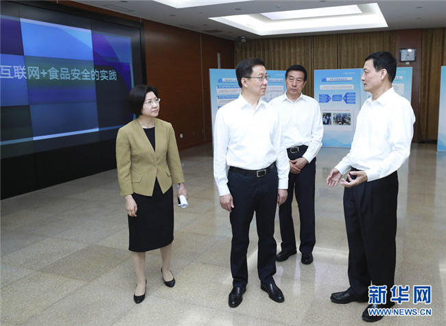 6月13日,在2019年全國食品安全宣傳周活動(dòng)前夕,中共中央政治局常委、國務(wù)院副總理、國務(wù)院食品安全委員會(huì)主任韓正到國務(wù)院食品安全委員會(huì)辦公室主持召開座談會(huì),聽取對食品安全工作的意見建議。這是會(huì)前,韓正參觀食品安全工作情況展示,考察了解食品安全智慧監(jiān)管的創(chuàng)新舉措。新華社記者龐興雷攝