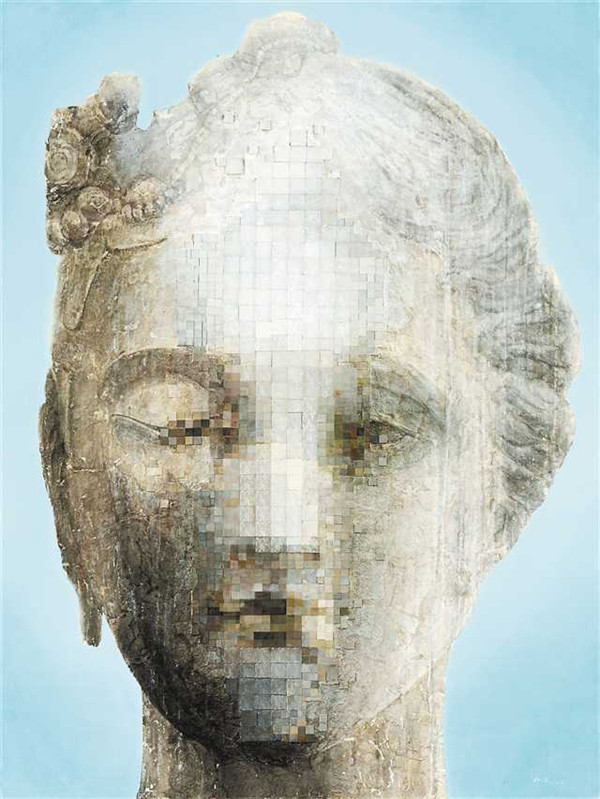 早在2017年,劉冠儒就開(kāi)始制作以中西方雕塑為主題的綜合材料繪畫作品,《融》則是他首次將東西方雕塑的形象融為一體。作品中的“維納斯”頭像,左邊為東方形象,右邊為西方形象,中間是馬賽克。馬賽克部分由300多個(gè)大小不同的紙板粘貼而成,作者在紙板上面反復(fù)打磨和暈染,形成豐富的肌理效果。