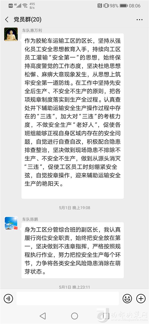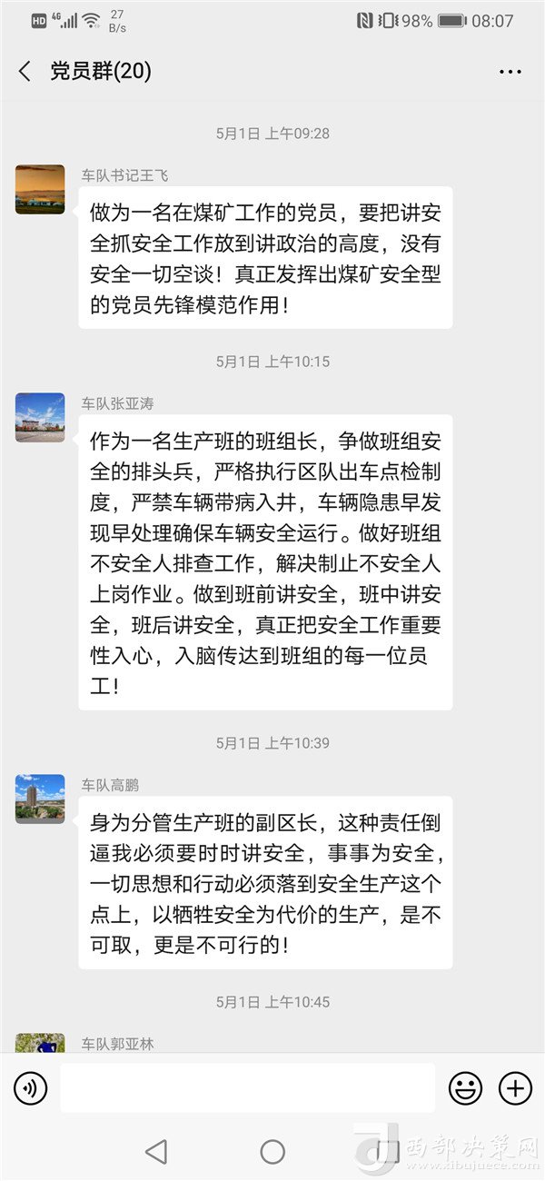 活動(dòng)期間,支部20名黨員認(rèn)真學(xué)習(xí)貫徹集團(tuán)公司、陜北礦業(yè)公司和公司近期安全生產(chǎn)文件材料宣貫落實(shí)精神,深刻吸取安全生產(chǎn)事故教訓(xùn),圍繞“守住安全生產(chǎn)這一‘生命線’,牢固確立‘四個(gè)最’的意識(shí)”工作目標(biāo),展開(kāi)了圍繞分管業(yè)務(wù)、自身崗位特點(diǎn)的討論學(xué)習(xí)。此次主題黨日活動(dòng),支部黨員紛紛談體會(huì)、講心得,結(jié)合工作中遇到的經(jīng)典案例,剖析了自身工作存在的短板和不足,并提出了具體的改進(jìn)措施。同時(shí),表示在今后工作中將充分發(fā)揮黨員的先鋒模范作用,擔(dān)當(dāng)作為、履職盡責(zé),做到帶頭反三違、帶頭降三違、身邊無(wú)三違。