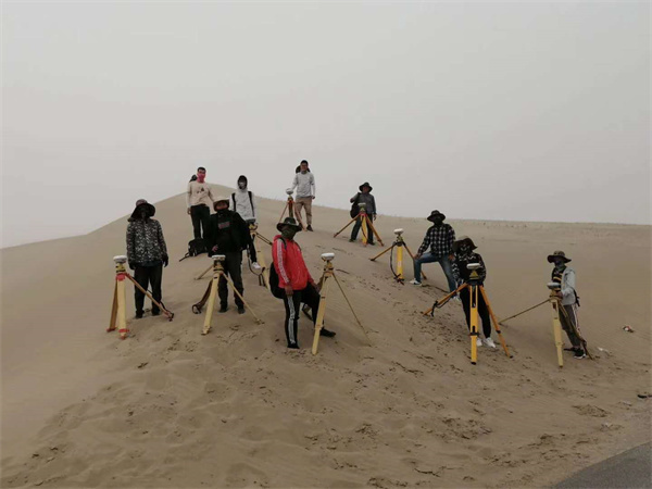 后來,唐飛帶領團隊又前往新疆若羌,為中鐵一局三公司和若鐵路項目進行前期控制網復測。項目線路長、地廣人稀,且地處塔克拉瑪干沙漠邊緣。為了節(jié)省時間,每天早上他和隊員背著馕、咸菜、礦泉水出發(fā),在沙漠戈壁一測就是十二個小時,晚上八九點左右才能回去吃口熱飯。有一次,他們在工地上測量時,突遇沙塵暴,他和三個組員趕快收拾儀器,裝進儀器箱,四個人圍在一起,等著沙塵暴過去。
