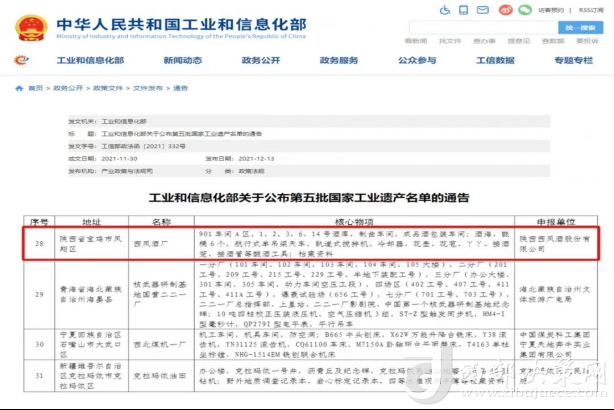 西部決策網(wǎng)訊(韓宗憲)12月13日,工業(yè)和信息化部公布了第五批國家工業(yè)遺產(chǎn)名單,西鳳酒釀酒工業(yè)遺產(chǎn)群作為唯一的中國白酒生產(chǎn)釀造項目同全國其他30家工業(yè)遺產(chǎn)一起進入名單。這也是繼6月10日國家級非物質(zhì)文化遺產(chǎn)榜單發(fā)布以來,西鳳榮列的又一重磅國家級名單。既標志了相關部門和廣大消費者對三千年無斷代西鳳酒釀造設備和釀造技藝的肯定,也表示出西鳳酒為中國白酒發(fā)展作出的突出貢獻。