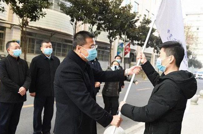 白曉旭從院黨委副書記馮廣林手里接過隊(duì)旗。西安交大第一附屬醫(yī)院供圖