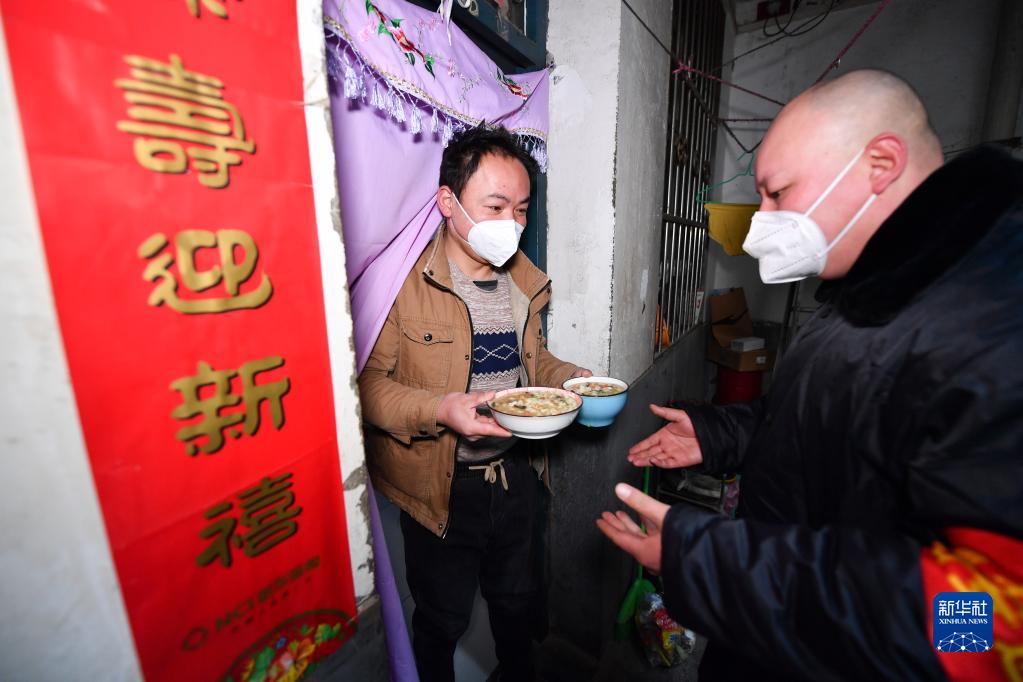 1月12日,三家村村民楊光(右)為租住在自家房屋的務工人員送上午餐。新華社記者 張博文 攝