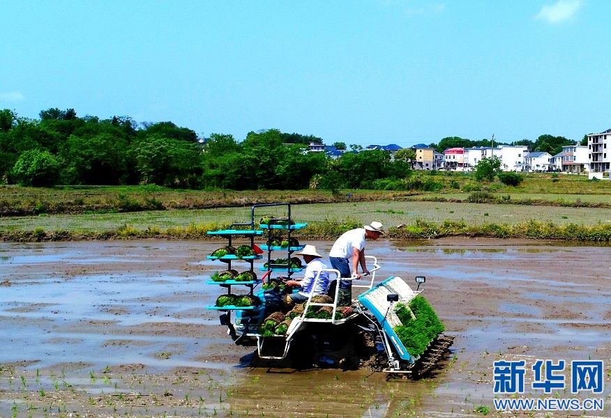 在江西省湖口縣新豐村的連片稻田里,周益和父親周愛霞正駕駛農機來回穿梭。新華網發(fā) 徐會剛 攝