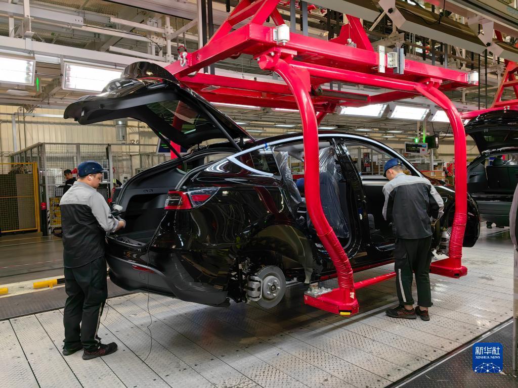 在特斯拉上海超級(jí)工廠,工人在車(chē)間內(nèi)忙碌(2月27日攝)。新華社記者 周蕊 攝