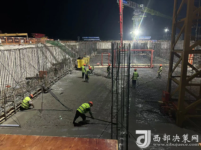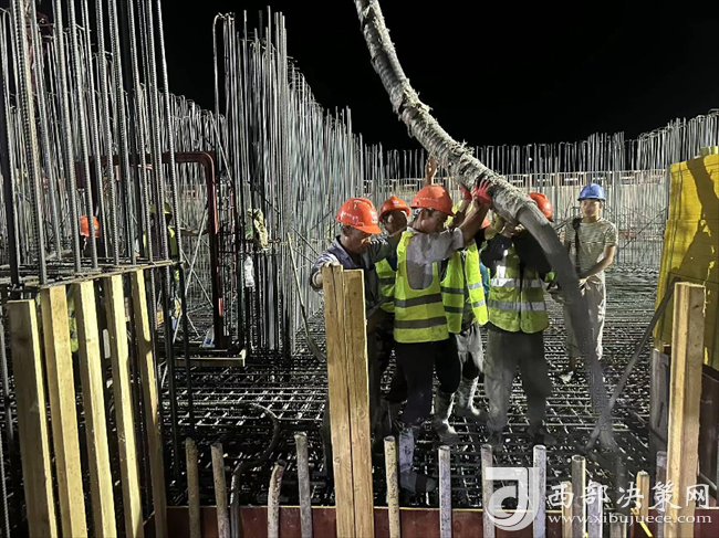 九層之臺(tái),始于壘土。筏板作為基礎(chǔ)工程最重要的組成部分,其質(zhì)量的好壞直接影響到上部結(jié)構(gòu)的穩(wěn)固性。在完成筏板鋼筋綁扎后,2臺(tái)長(zhǎng)臂泵車、34輛混凝土罐車開始送料。澆筑期間,映入眼簾的是一片繁忙之景,22名管理人員,110余名勞務(wù)人員正以時(shí)不我待的緊迫感,全力以赴抓緊抓實(shí)項(xiàng)目建設(shè),共同助力項(xiàng)目建設(shè)跑出加速度。