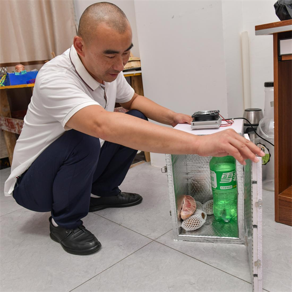 只有初中文憑的楊波就開始學習冰箱知識,了解冰箱原理結構:為什么會制冷還能調(diào)節(jié)溫度?等等,做到了了然于胸,又購買了冷卻片、制冷片、散熱片、風扇、溫度計、封條等必備用料,自己又在工地找到了廢棄的塑膠板,在家具店里找來隔熱錫紙,經(jīng)過一番折騰,一臺高60 厘米、寬40厘米、厚40厘米的手工小冰箱做成功了。使用2個月來,最低溫度可達2攝氏度。效果非常好!
