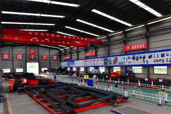 作為臨建標(biāo)準(zhǔn)化建設(shè)的重要標(biāo)志,桂鐘5、8標(biāo)段的鋼筋加工廠,廠房高度12米,作業(yè)場地平整、硬化。加工場內(nèi)醒目位置都設(shè)置工程公示牌、施工平面布置圖、安全生產(chǎn)牌、消防保衛(wèi)牌、管理人員名單及監(jiān)督電話牌、文明施工牌等明示標(biāo)志。加工廠內(nèi)按照功能設(shè)立了原材料堆放區(qū)、鋼筋下料區(qū)、加工制作區(qū)、鋼筋籠預(yù)拼接區(qū)、半成品堆放區(qū);還設(shè)置安裝了龍門數(shù)控切割機(jī)、全自動數(shù)控液壓鋼筋調(diào)直切斷機(jī)、鋼筋快速鋸床、數(shù)控鋼筋彎曲機(jī)、數(shù)控鋼筋調(diào)直機(jī)、數(shù)控鋼筋彎箍機(jī)、數(shù)字化工業(yè)焊接機(jī)器人、數(shù)控滾籠焊機(jī)、數(shù)控立式彎曲中心、全自動數(shù)控彎箍機(jī)、鋸切套絲打磨生產(chǎn)線等等機(jī)械化、數(shù)字化設(shè)備并懸掛著機(jī)械操作安全規(guī)定公示牌和設(shè)備標(biāo)示牌。這些工裝工藝標(biāo)準(zhǔn)化為項(xiàng)目部標(biāo)準(zhǔn)化建設(shè)賦能。