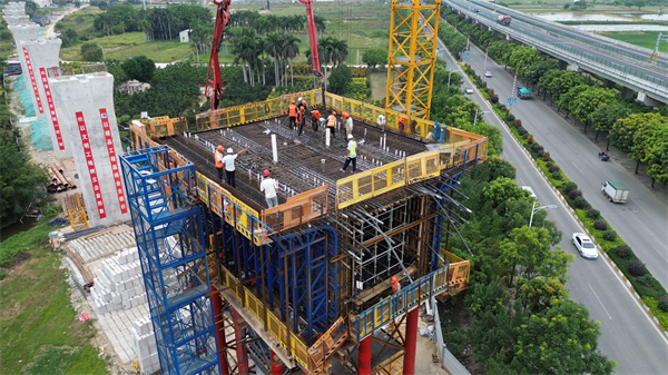 浮洋站至潮汕站特大橋全長5412.02公里,共設計建設3聯(lián)連續(xù)梁,其中上跨潮汕環(huán)線高速(50+80+80+50)米連續(xù)梁為工區(qū)內(nèi)控制性工程,連續(xù)梁全長260米。設計樁基60根,承臺5個,墩身5個,由285#和289#兩個邊墩、286#、287#、288#三個主墩組成的四跨一聯(lián)連續(xù)梁。288#主墩0#塊長12m,寬11.2m,高6m,預應力管道、橫隔板、預埋件多,鋼筋扎綁密,需要從底板到腹板再到頂板,自下而上進行澆筑,采用高等級強度的C50混凝土,設計混凝土方量260方。