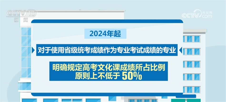 此外,2024年起,對(duì)于使用省級(jí)統(tǒng)考成績作為專業(yè)考試成績的專業(yè),明確規(guī)定高考文化課成績所占比例原則上不低于50%。同時(shí),鼓勵(lì)??几咝=Y(jié)合專業(yè)培養(yǎng)要求,進(jìn)一步提高考生高考文化課成績錄取要求。