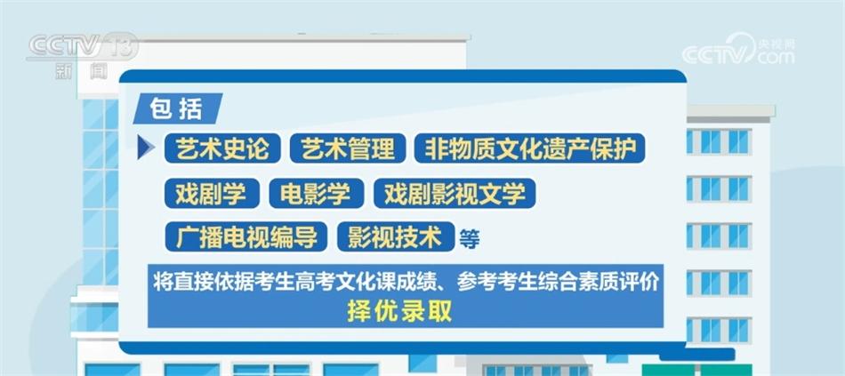 據(jù)了解,藝術(shù)類專業(yè)依據(jù)考生高考文化成績、專業(yè)考試成績,參考綜合素質(zhì)評(píng)價(jià)進(jìn)行招生錄取。此次藝考改革一個(gè)重要的變化是,部分藝術(shù)類專業(yè)不再組織專業(yè)考試,包括藝術(shù)史論、藝術(shù)管理、非物質(zhì)文化遺產(chǎn)保護(hù)、戲劇學(xué)、電影學(xué)、戲劇影視文學(xué)、廣播電視編導(dǎo)、影視技術(shù)等,將直接依據(jù)考生高考文化課成績、參考考生綜合素質(zhì)評(píng)價(jià),擇優(yōu)錄取。