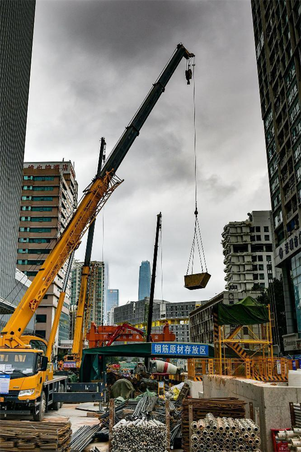 我們?cè)谧鳛楫?dāng)下施工主戰(zhàn)場(chǎng)的2號(hào)工點(diǎn)地面東邊施工現(xiàn)場(chǎng)看到,沒(méi)有明顯標(biāo)識(shí)卻能一眼分辨的“迷你”鋼筋加工場(chǎng)里,7、8名穿著“鋼筋工”馬甲的工人,或給鋼筋套絲,或彎制鋼筋構(gòu)件,或忙著調(diào)運(yùn)鋼筋捆……忙而不亂;在西邊,一臺(tái)抓斗機(jī)把土方從基坑里提出來(lái)放入旁邊的鐵鐵質(zhì)料斗箱里,一臺(tái)挖掘機(jī)又將箱里的土轉(zhuǎn)倒裝在運(yùn)土車(chē)?yán)?,土裝滿(mǎn)后鏟斗又將土壓實(shí)、將車(chē)幫上緣的土刮干凈,防止土在運(yùn)輸中掉落……