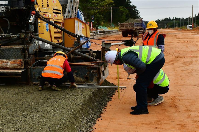 筆者在現場看到,運輸車將水穩(wěn)料緩緩倒入攤鋪機料斗里,2名司機開著攤鋪機緩緩前行,現場管理人員和作業(yè)人員互相配合,不時測量著攤鋪厚度……攤鋪到了50米左右,壓路機開始進行碾壓作業(yè)……