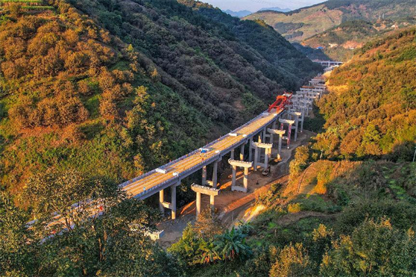 隆林樞紐立交橋,從航拍圖上看,通向四方的幾條匝道像是龍爪,主線似龍身,組成了猶如盤踞在山間的“龍”。在架設(shè)匝道T梁時(shí),按照施工組織設(shè)計(jì),T梁從D匝道推進(jìn)到上跨汕昆高速公路單獨(dú)的鋼箱梁吊架是已經(jīng)合龍的。但架梁展開時(shí)意外出現(xiàn),鋼箱梁因其他原因未能到位——似乎成了考驗(yàn)魏玉“虎”能否撼動(dòng)這條“龍”的試金石。魏玉虎應(yīng)急預(yù)案祭出:運(yùn)梁車把T梁運(yùn)到鋼箱梁附近,吊車把3跨梁吊架到鄰近D匝道的A匝道上,架橋機(jī)通過過渡工程,在A匝道繼續(xù)架梁;A匝道就成為關(guān)鍵線路,項(xiàng)目部立即集中火力搶做A匝道上的橋墩,確保架梁能繞道繼續(xù)前進(jìn)。這可以說“虎”勝“龍”。