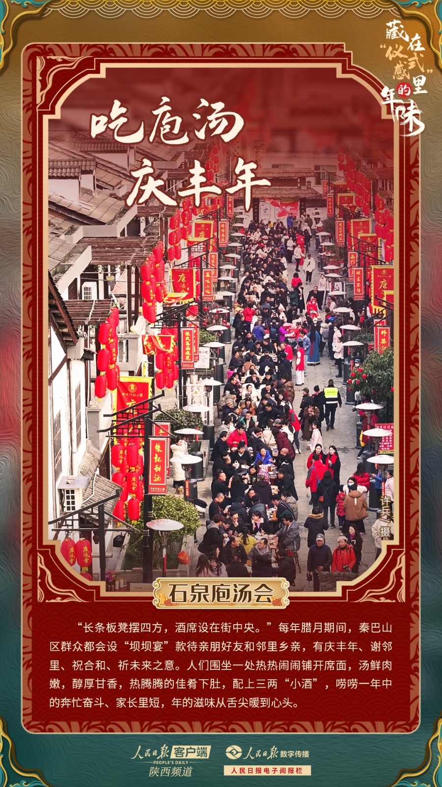賞盛世花燈、逛特色廟會、看火熱“村晚”,人們在沉浸式、有滋味的豐富體驗中獲得節(jié)日飽滿的情緒價值;男女老少、家家戶戶擺上長桌圍坐一處“吃庖湯”,在熱熱鬧鬧的舉杯相慶中,讓陜西的“吃席”文化拉滿春節(jié)的節(jié)日氣氛;長輩們給小娃娃掛上象征吉祥如意的“棗牌牌”,從土地里結(jié)出的紅棗子、生長出的谷草秸,包裹著心意滿滿的溫暖寄望,也蘊含著鄉(xiāng)土中國的深沉情結(jié)......