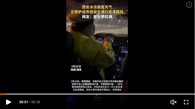 西安冰凍雨雪天氣交警護(hù)送市民 網(wǎng)友:安全感拉滿