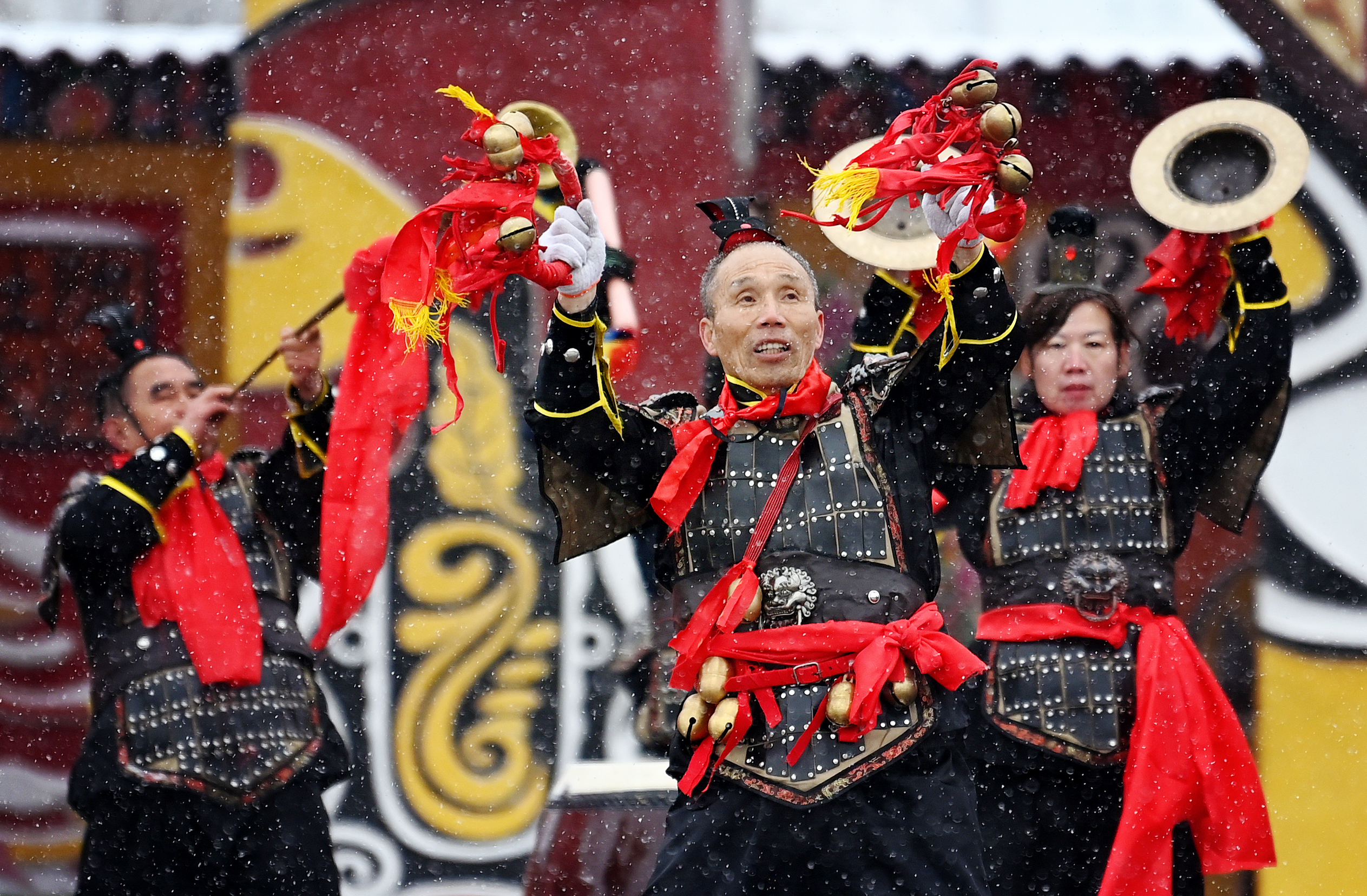 2月22日,在隴州社火過(guò)大年暨陜西省民間社火展演上,來(lái)自咸陽(yáng)市的社火隊(duì)在表演秦漢戰(zhàn)鼓。新華社記者劉瀟攝