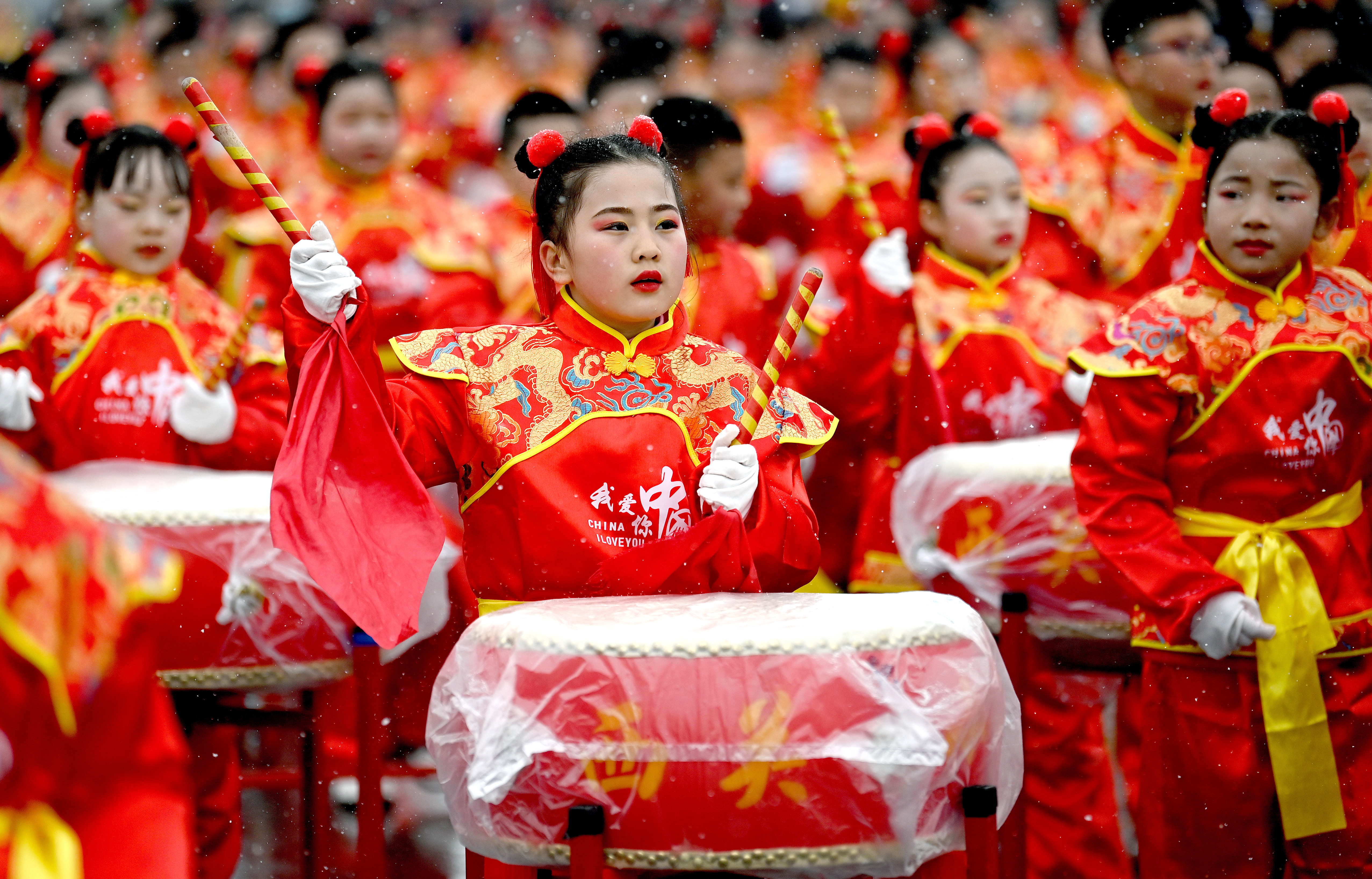 2月22日,在隴州社火過(guò)大年暨陜西省民間社火展演上,隴縣百人少兒鑼鼓隊(duì)在進(jìn)行巡游。新華社記者劉瀟攝